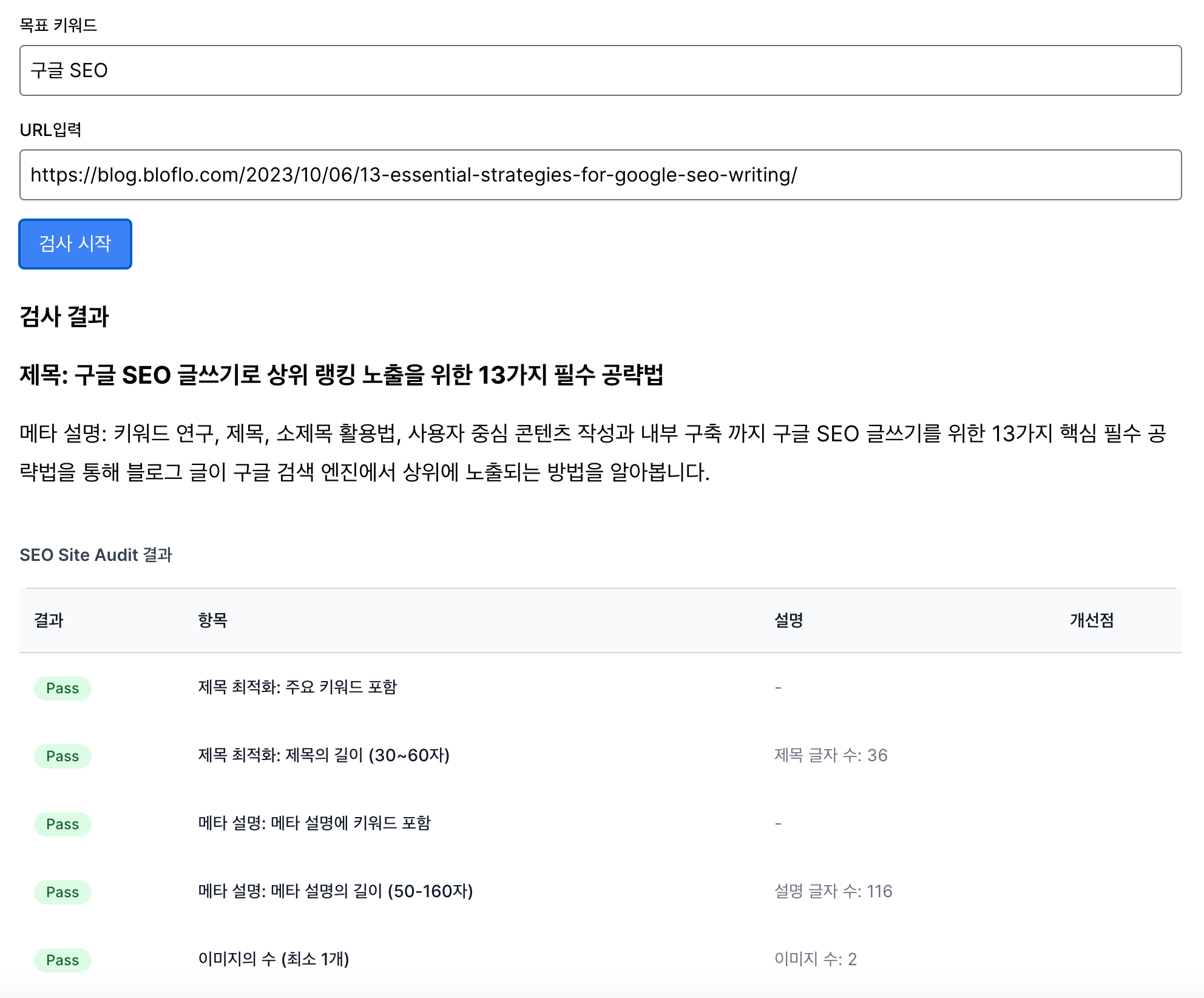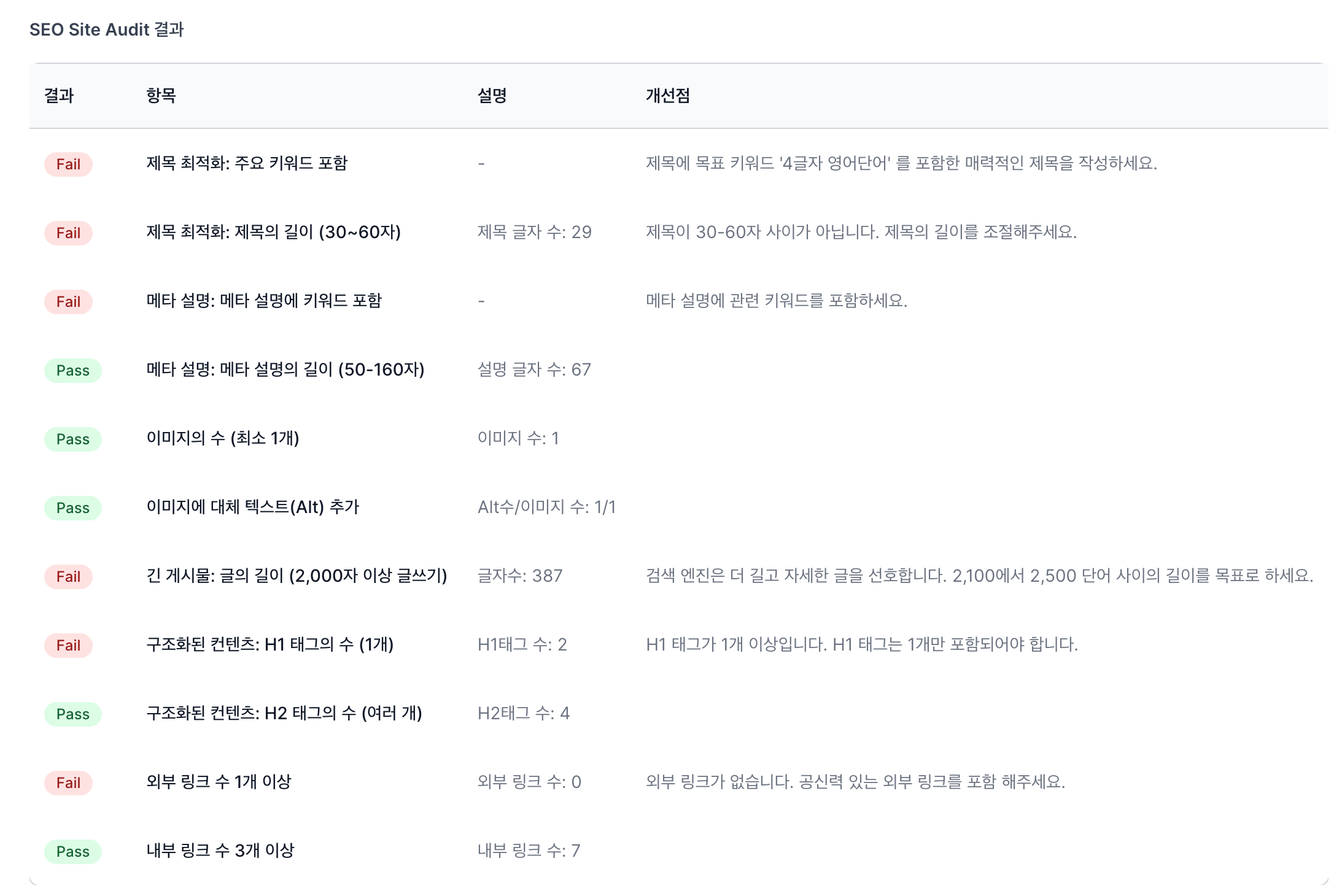 검증 결과를 보고 개선점을 수정 하면 SEO에 유리한 글을 작성 할 수 있습니다.