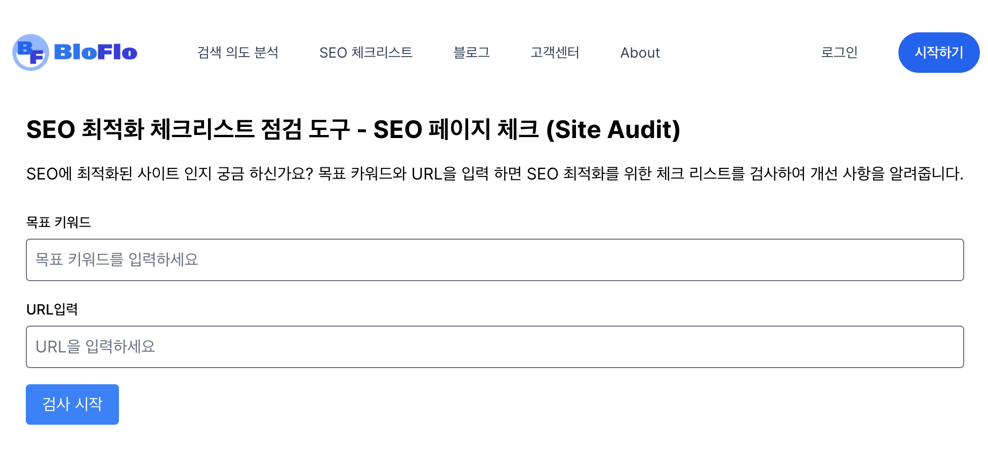 마지막으로 검증 도구 활용법을 소개 합니다. 먼저 SEO를 원하는 목표 키워드를 입력 하고 검사가 필요한 URL을 입력 합니다.